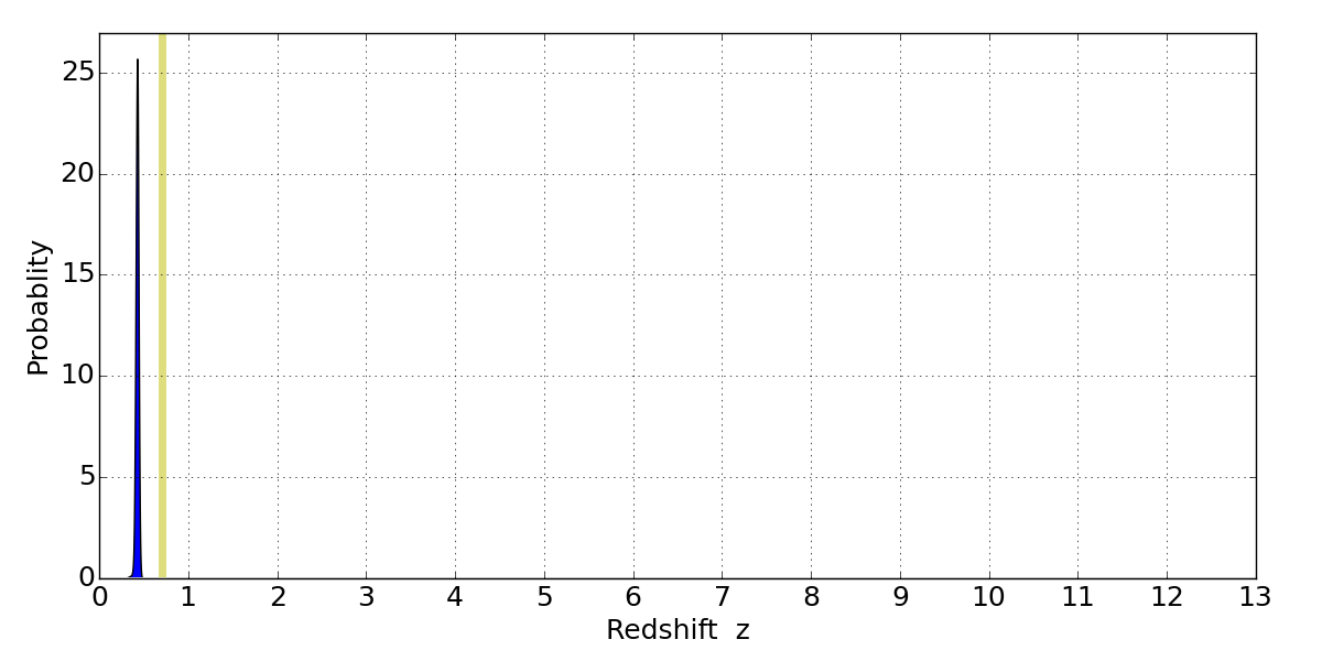 In P(z) plots: Yellow lines mark the cluster redshift z = 0.702,