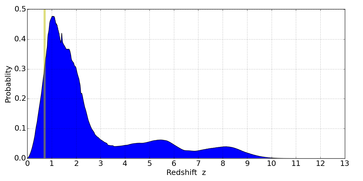 In P(z) plots: Yellow lines mark the cluster redshift z = 0.702,