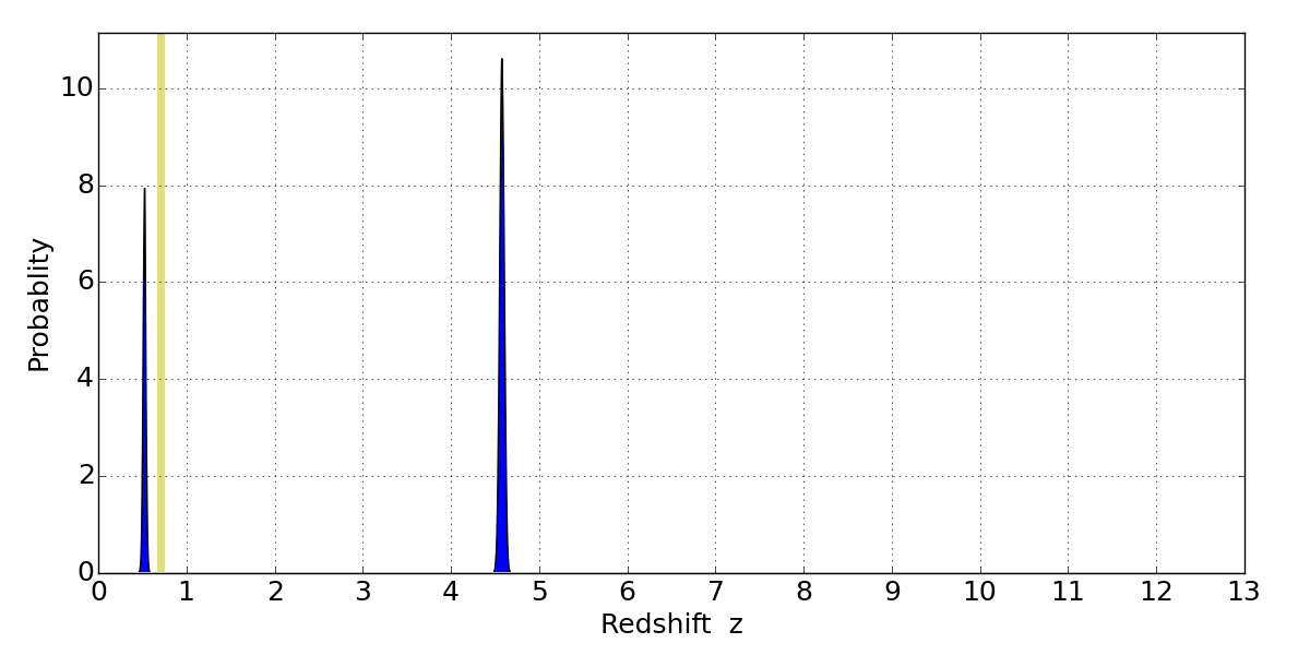 In P(z) plots: Yellow lines mark the cluster redshift z = 0.702,