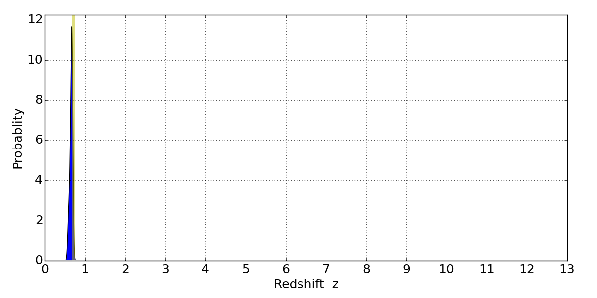In P(z) plots: Yellow lines mark the cluster redshift z = 0.702,