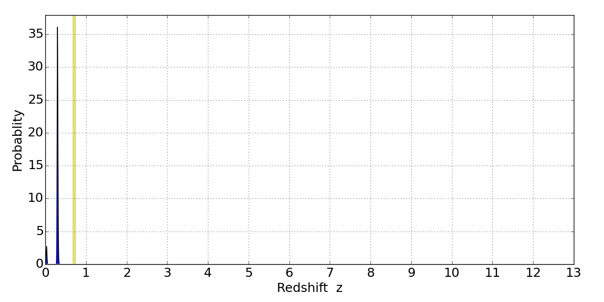 In P(z) plots: Yellow lines mark the cluster redshift z = 0.702,