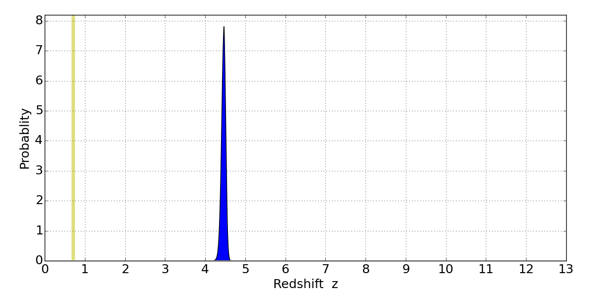 In P(z) plots: Yellow lines mark the cluster redshift z = 0.702,