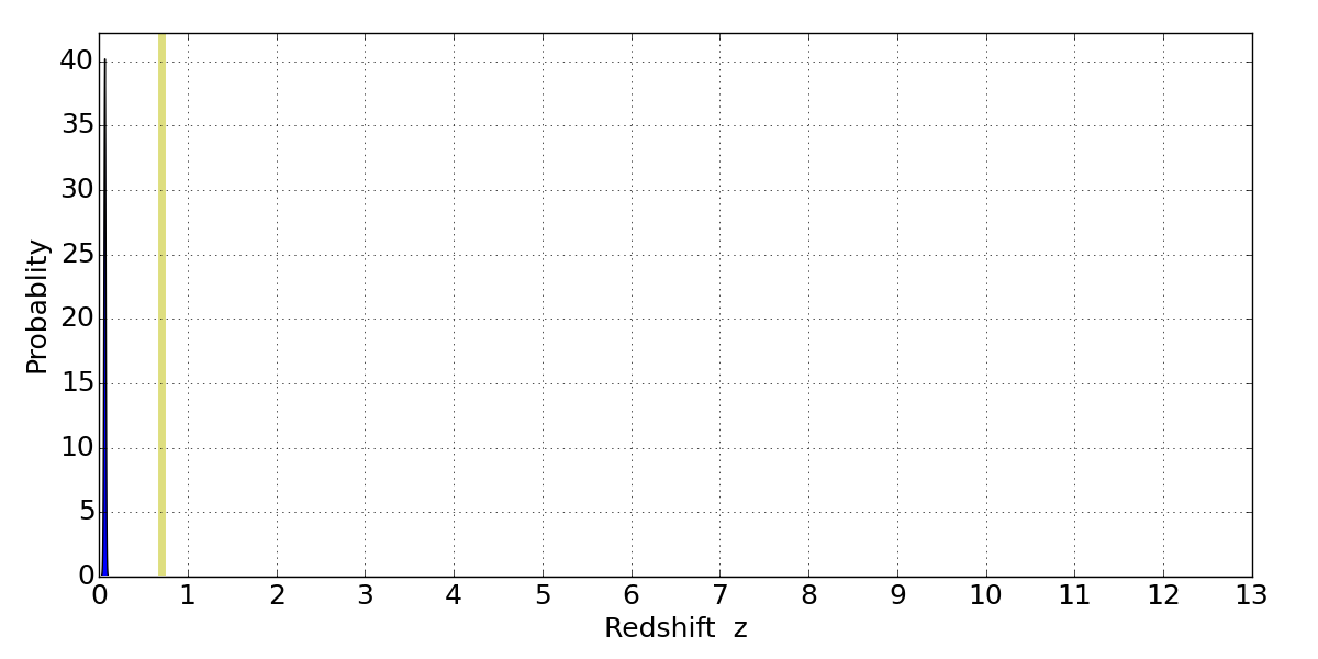 In P(z) plots: Yellow lines mark the cluster redshift z = 0.702,