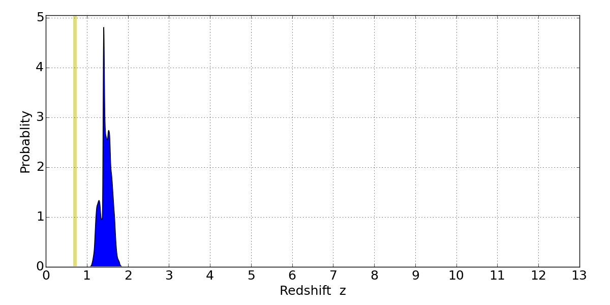 In P(z) plots: Yellow lines mark the cluster redshift z = 0.702,