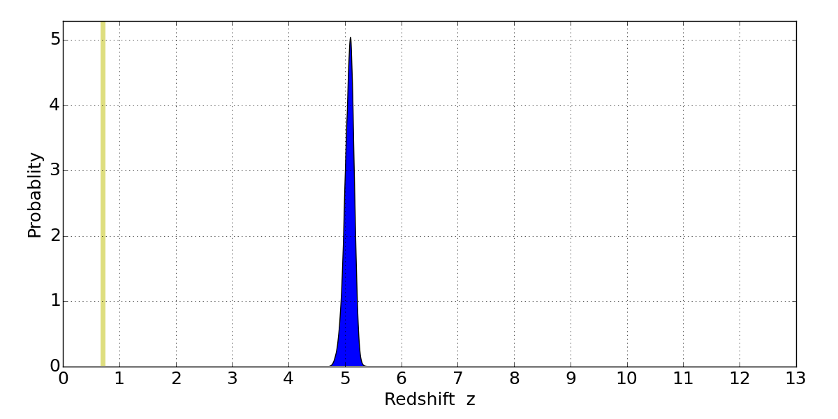In P(z) plots: Yellow lines mark the cluster redshift z = 0.702,