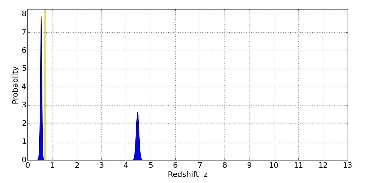 In P(z) plots: Yellow lines mark the cluster redshift z = 0.702,