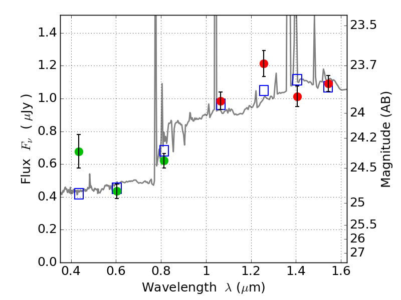 Object #1081   x,y = (2362, 3407)   RA, Dec = (03:12:57.648, 08:23:15.36) = (48.24020, 8.38760)   BPZ = 1.081 [0.991--1.647]   type = 9.40 (SB2_B10 - SB3_B10)   stellarity = 0.00   chisq2 = 2.06   ODDS = 0.55   z_cluster = 0.270