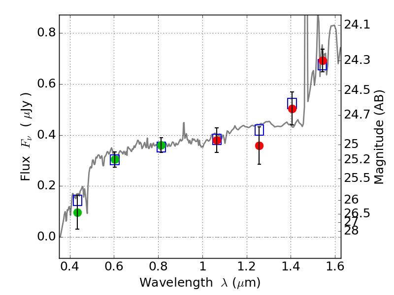 Object #2055   x,y = (1152, 2725)   RA, Dec = (03:13:02.544, 08:22:34.32) = (48.26060, 8.37620)   BPZ = 2.945 [2.618--3.334]   type = 9.10 (SB2_B10 - SB3_B10)   stellarity = 0.00   chisq2 = 0.25   ODDS = 0.65   z_cluster = 0.270