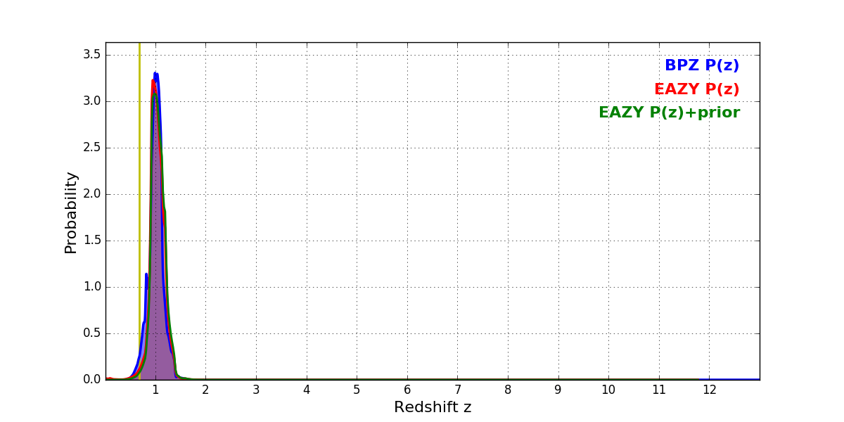 In P(z) plots: Yellow lines mark the cluster redshift z = 0.677,