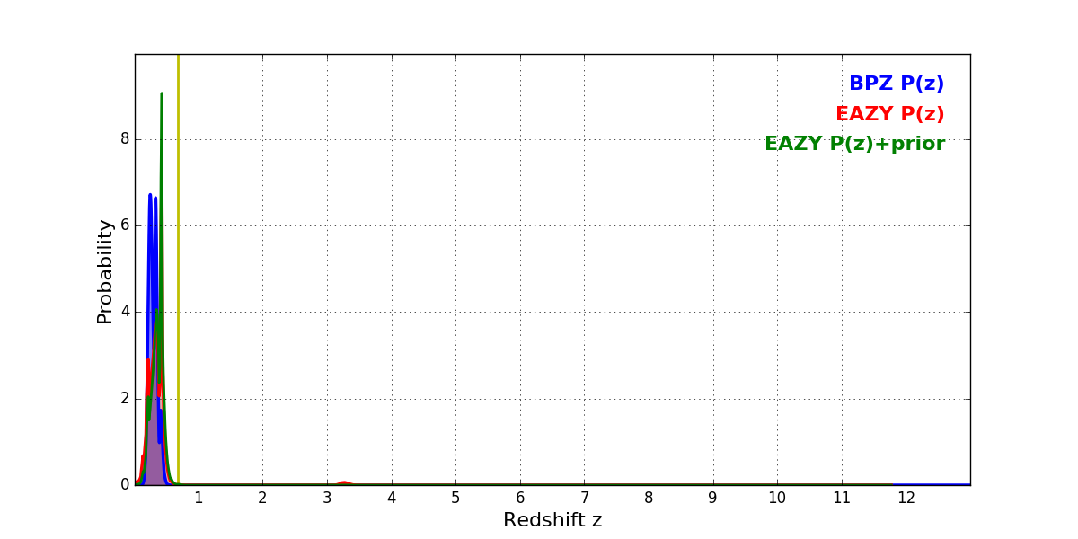 In P(z) plots: Yellow lines mark the cluster redshift z = 0.677,