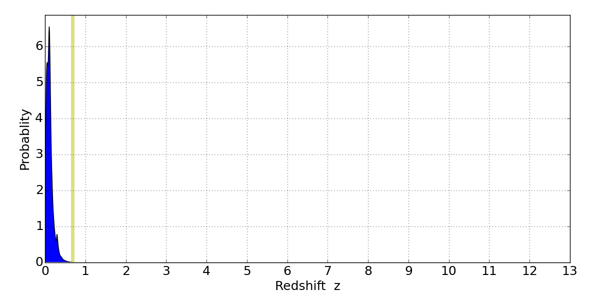 In P(z) plots: Yellow lines mark the cluster redshift z = 0.677,
