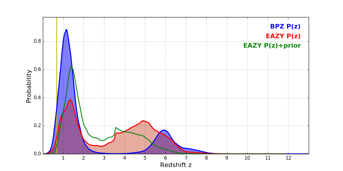 In P(z) plots: Yellow lines mark the cluster redshift z = 0.677,