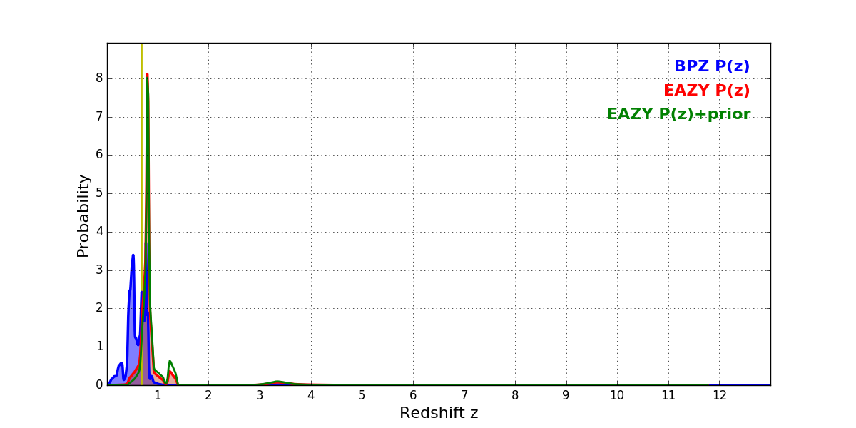 In P(z) plots: Yellow lines mark the cluster redshift z = 0.677,