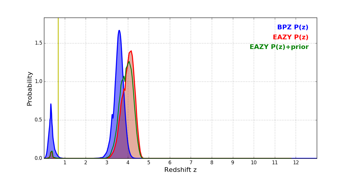 In P(z) plots: Yellow lines mark the cluster redshift z = 0.677,