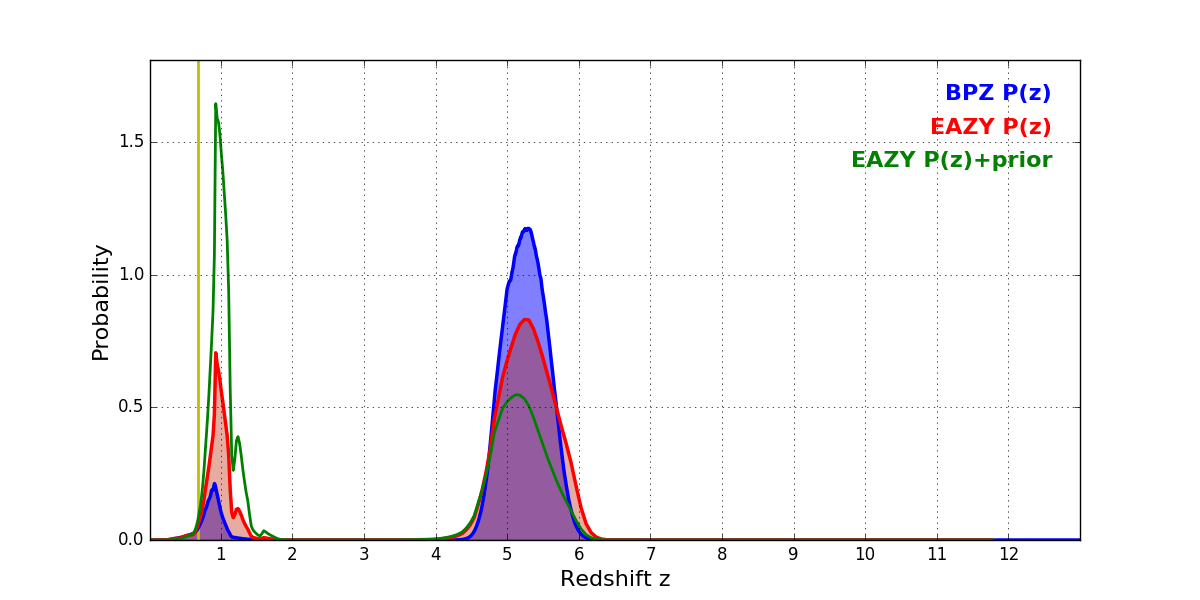 In P(z) plots: Yellow lines mark the cluster redshift z = 0.677,