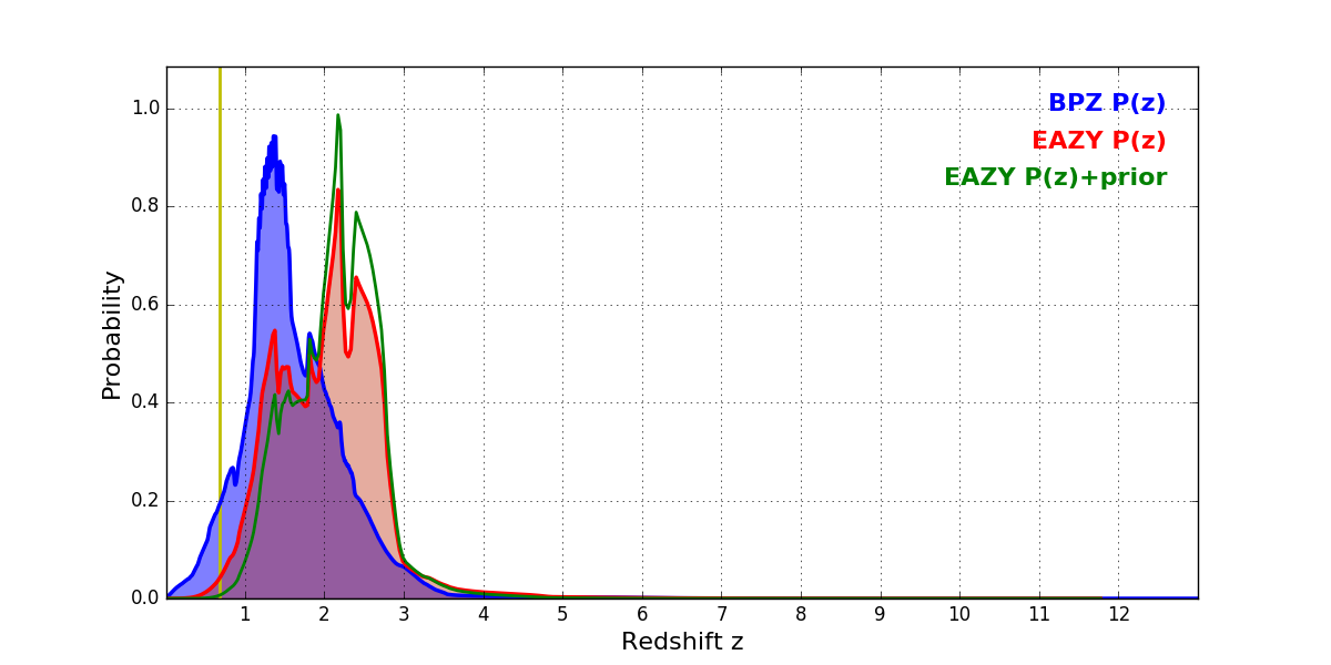In P(z) plots: Yellow lines mark the cluster redshift z = 0.677,