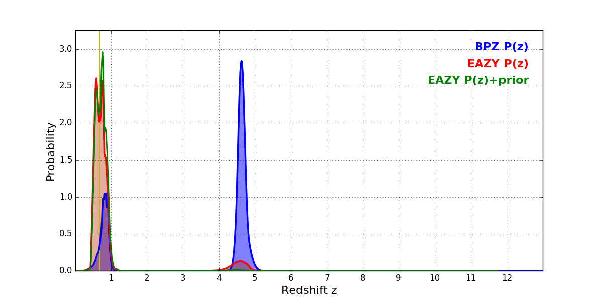 In P(z) plots: Yellow lines mark the cluster redshift z = 0.677,