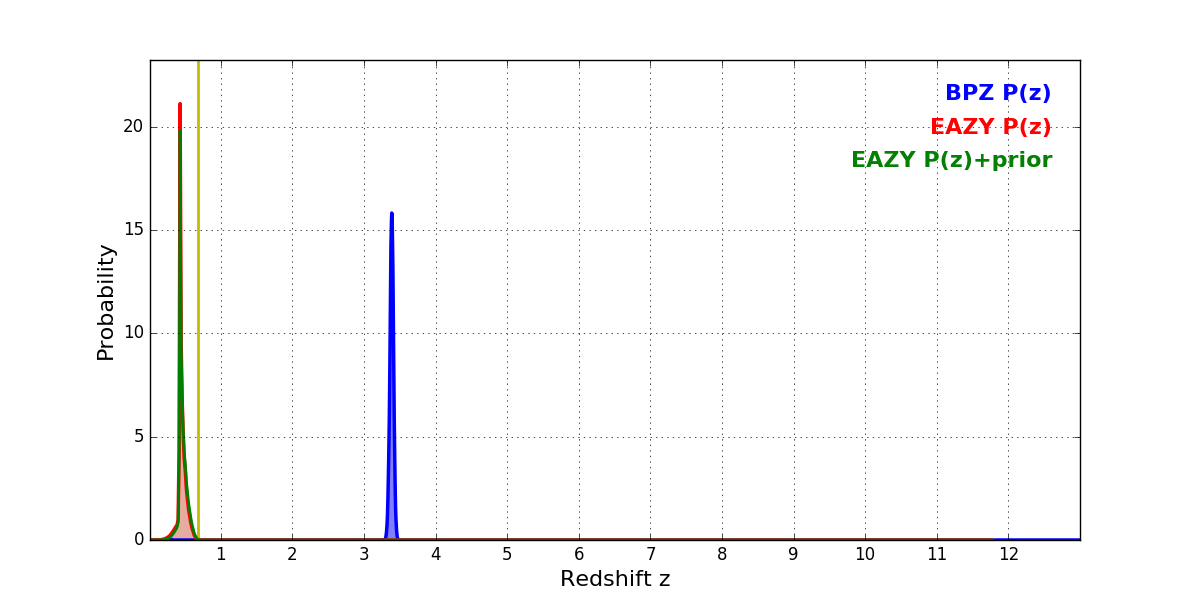 In P(z) plots: Yellow lines mark the cluster redshift z = 0.677,