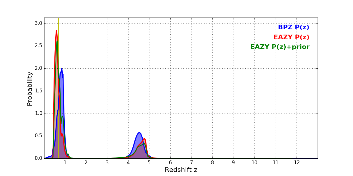 In P(z) plots: Yellow lines mark the cluster redshift z = 0.677,