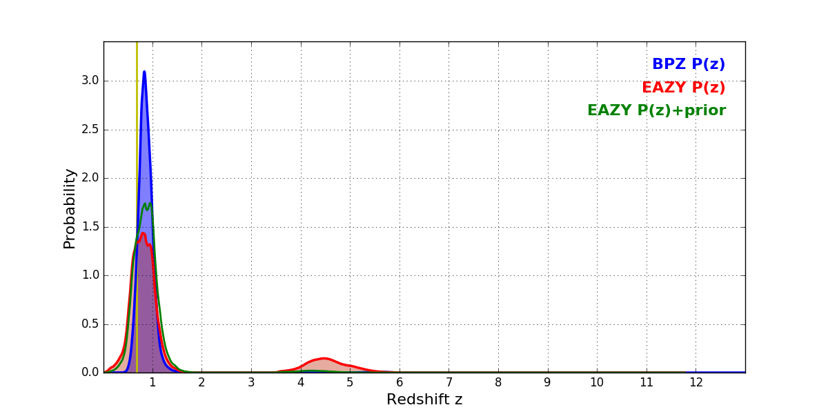 In P(z) plots: Yellow lines mark the cluster redshift z = 0.677,