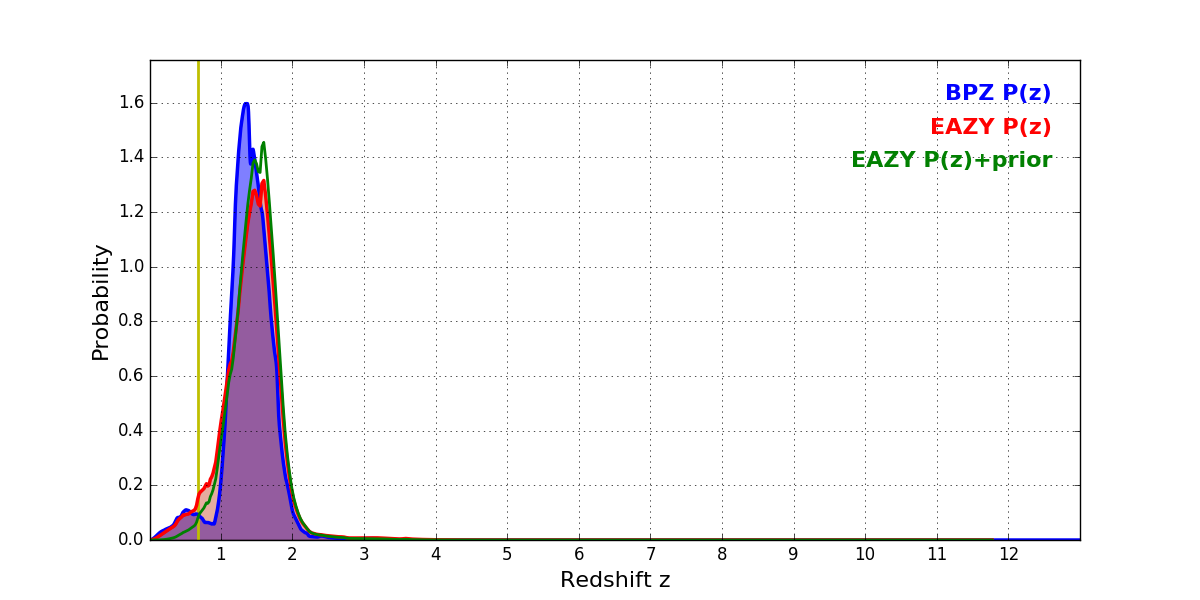 In P(z) plots: Yellow lines mark the cluster redshift z = 0.677,