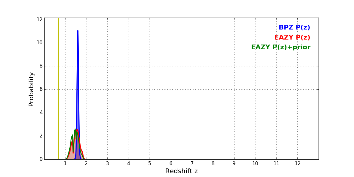 In P(z) plots: Yellow lines mark the cluster redshift z = 0.677,