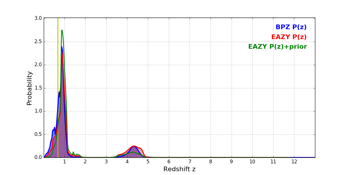 In P(z) plots: Yellow lines mark the cluster redshift z = 0.677,
