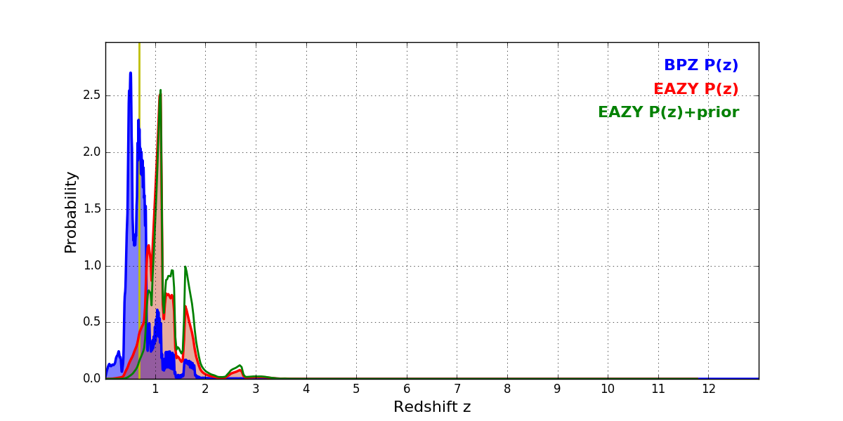 In P(z) plots: Yellow lines mark the cluster redshift z = 0.677,