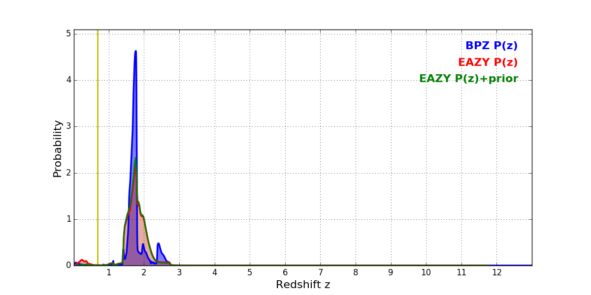 In P(z) plots: Yellow lines mark the cluster redshift z = 0.677,