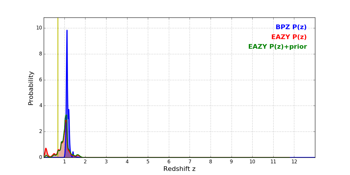 In P(z) plots: Yellow lines mark the cluster redshift z = 0.677,