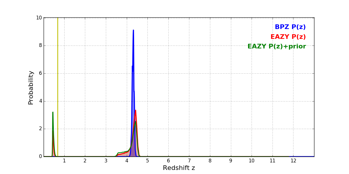 In P(z) plots: Yellow lines mark the cluster redshift z = 0.677,