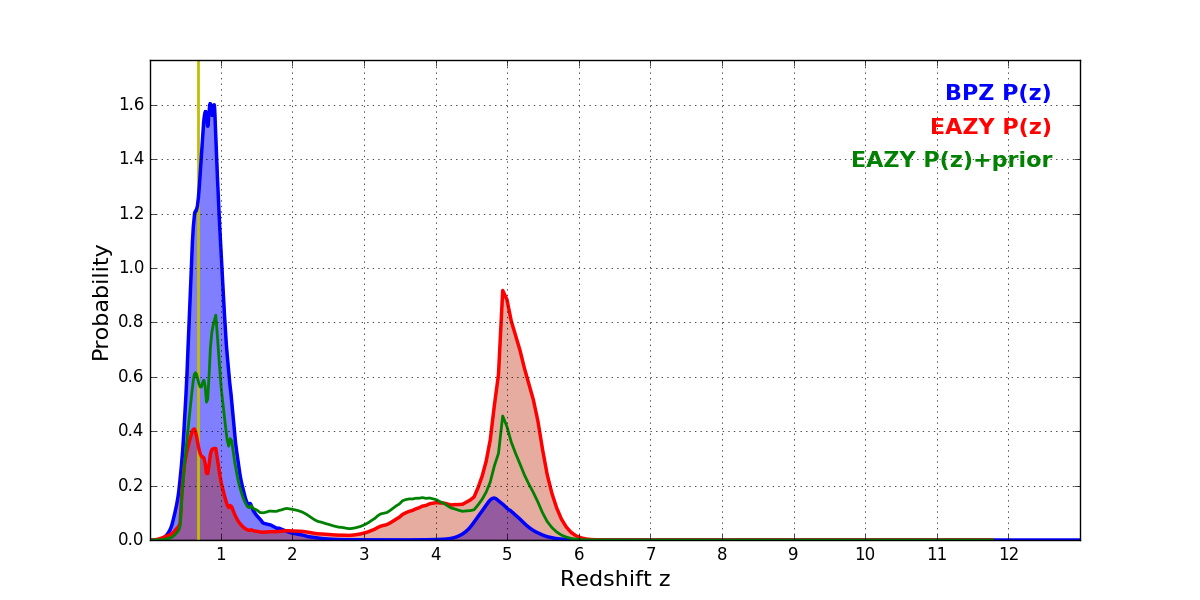 In P(z) plots: Yellow lines mark the cluster redshift z = 0.677,