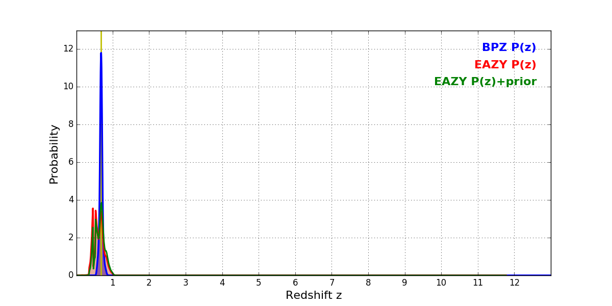 In P(z) plots: Yellow lines mark the cluster redshift z = 0.677,