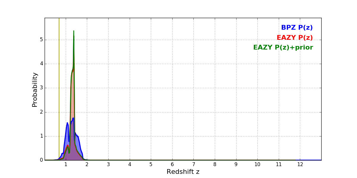 In P(z) plots: Yellow lines mark the cluster redshift z = 0.677,