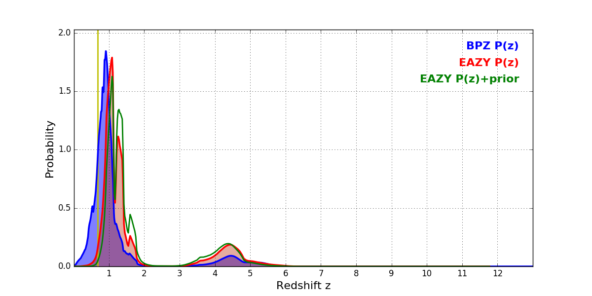 In P(z) plots: Yellow lines mark the cluster redshift z = 0.677,