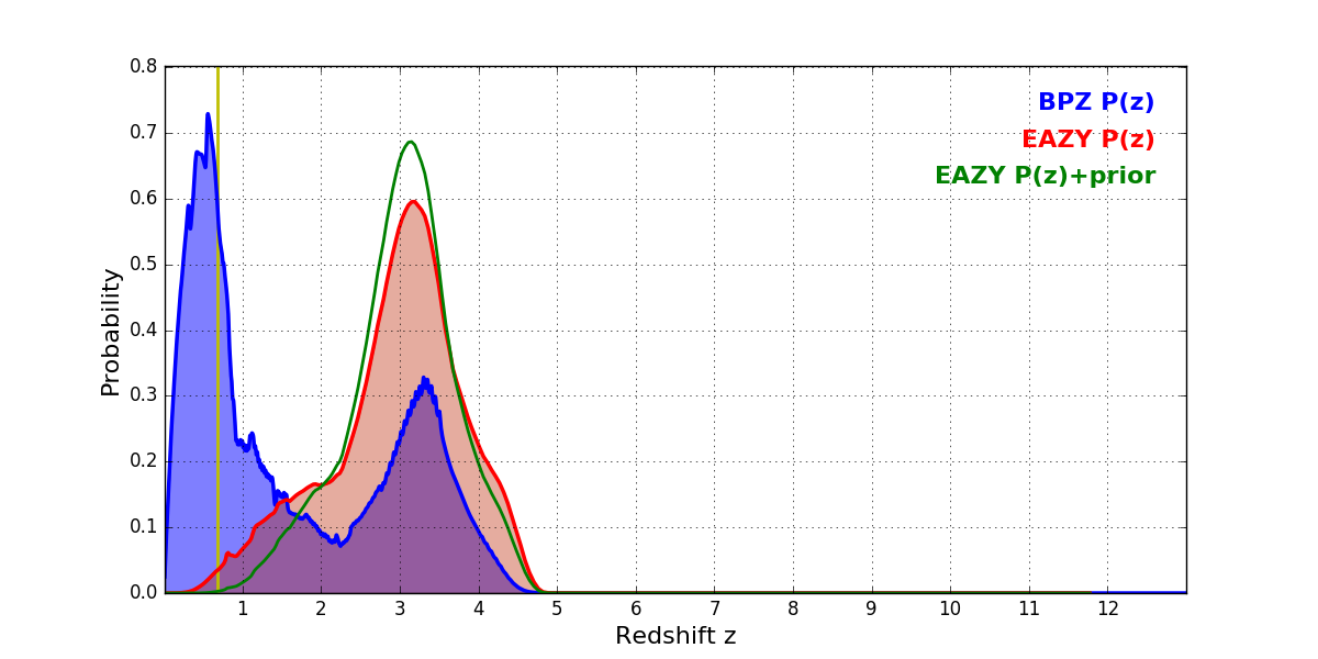 In P(z) plots: Yellow lines mark the cluster redshift z = 0.677,