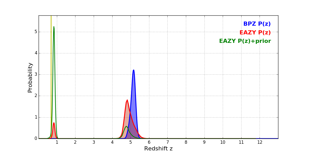 In P(z) plots: Yellow lines mark the cluster redshift z = 0.677,
