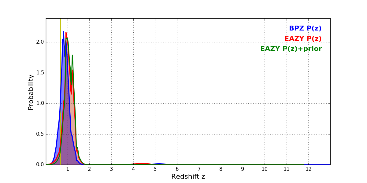 In P(z) plots: Yellow lines mark the cluster redshift z = 0.677,