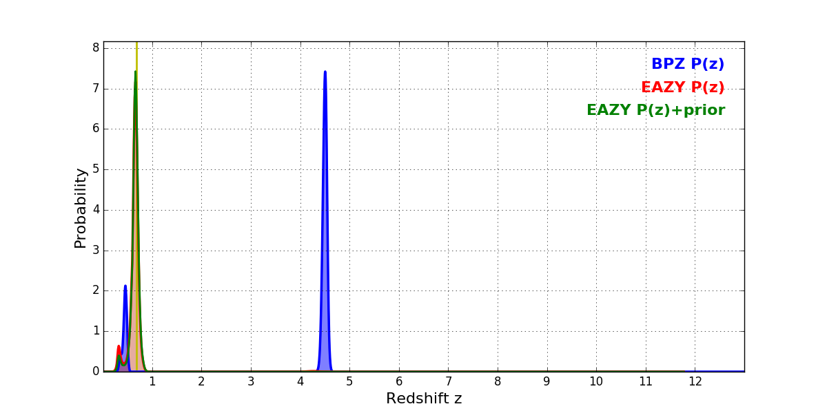 In P(z) plots: Yellow lines mark the cluster redshift z = 0.677,