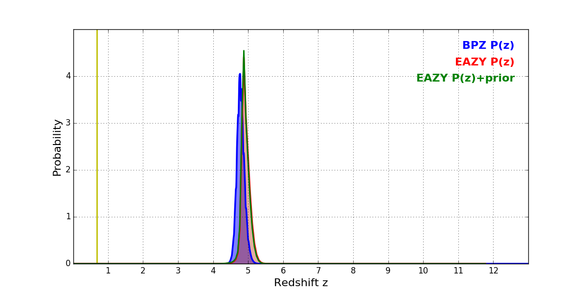 In P(z) plots: Yellow lines mark the cluster redshift z = 0.677,