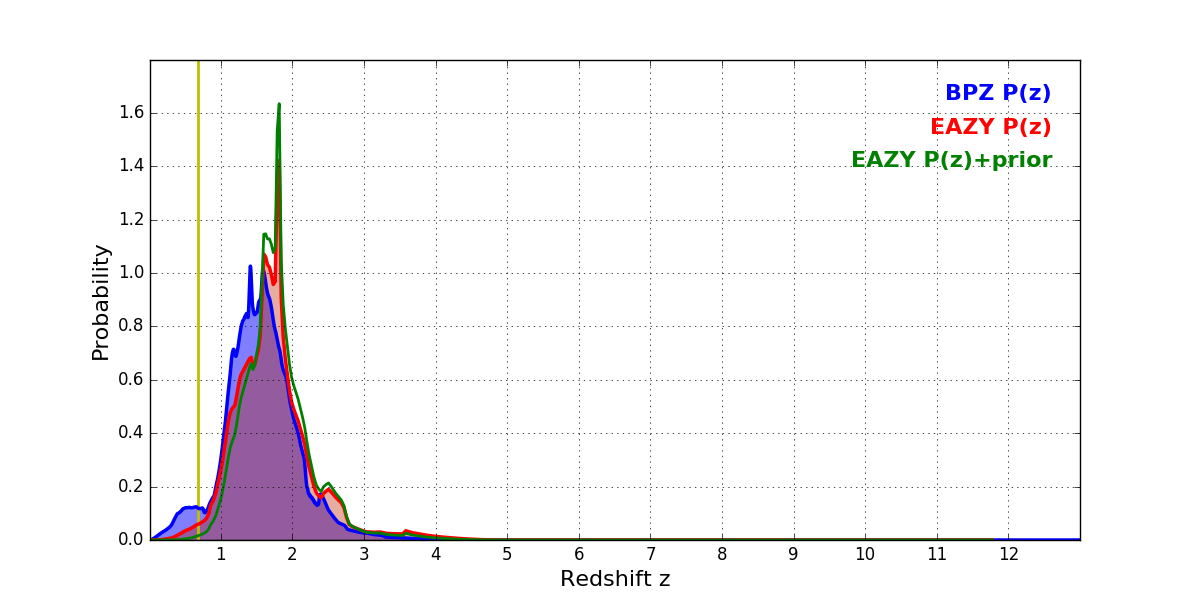 In P(z) plots: Yellow lines mark the cluster redshift z = 0.677,
