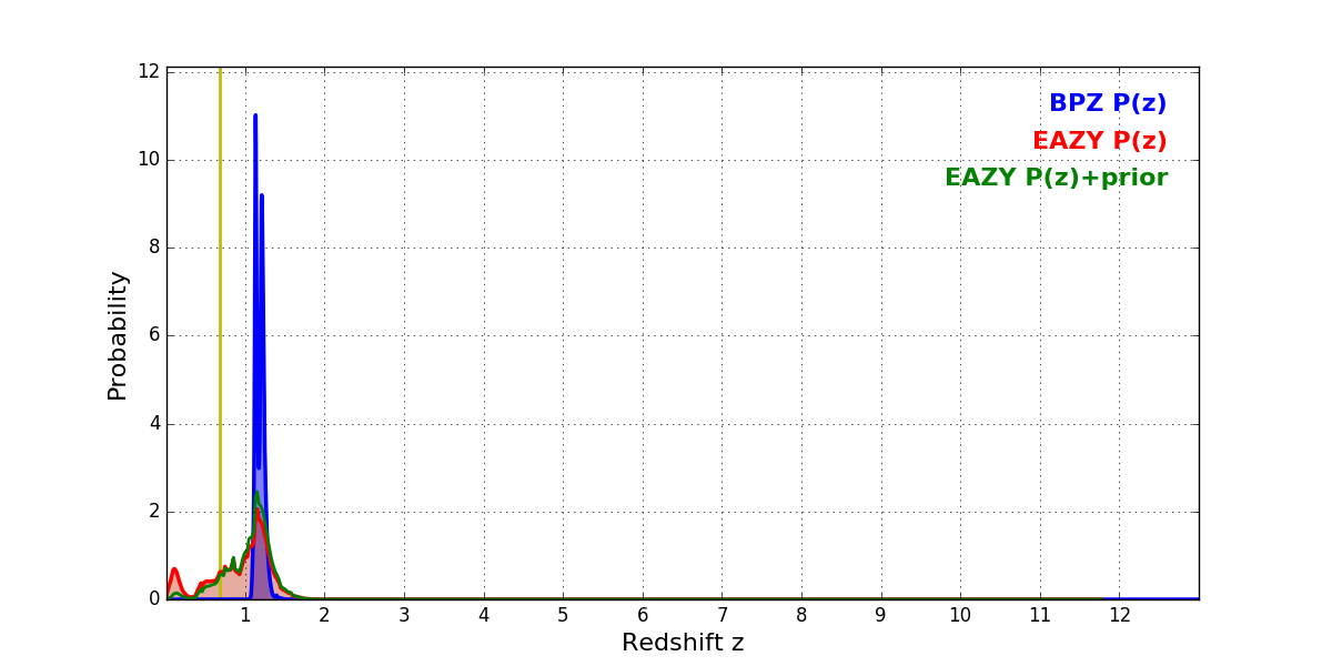In P(z) plots: Yellow lines mark the cluster redshift z = 0.677,