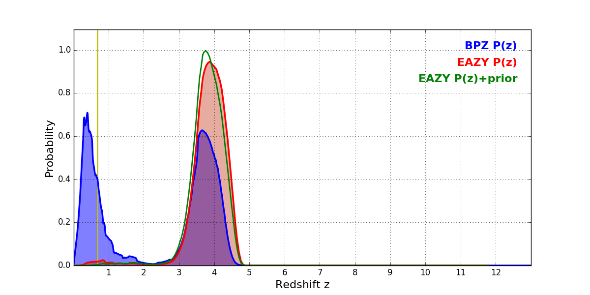 In P(z) plots: Yellow lines mark the cluster redshift z = 0.677,