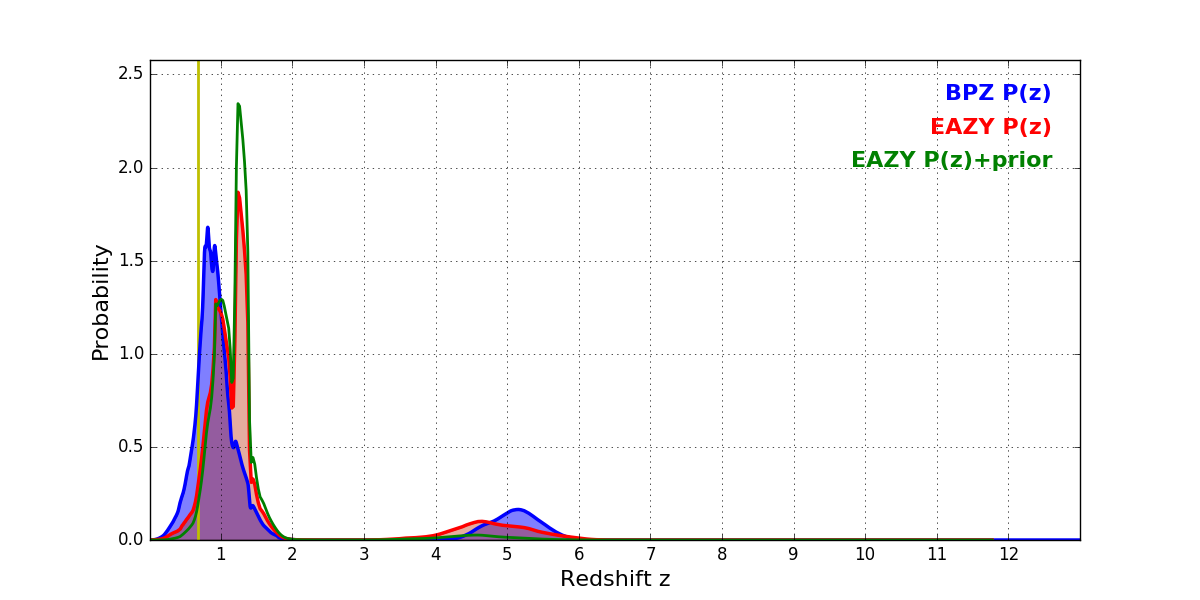 In P(z) plots: Yellow lines mark the cluster redshift z = 0.677,