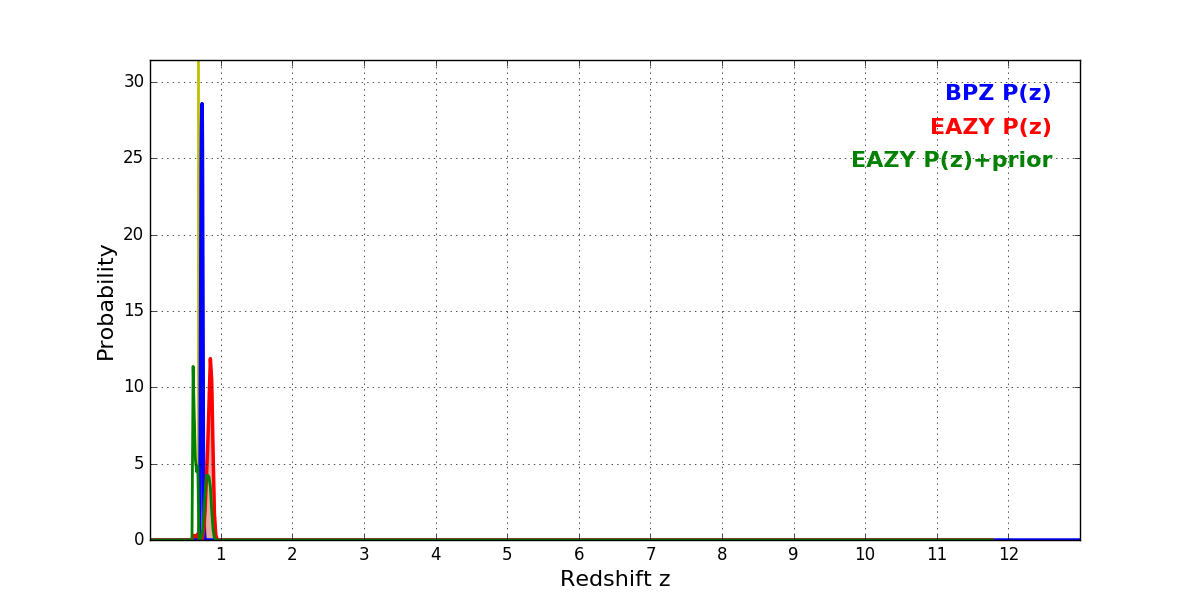 In P(z) plots: Yellow lines mark the cluster redshift z = 0.677,
