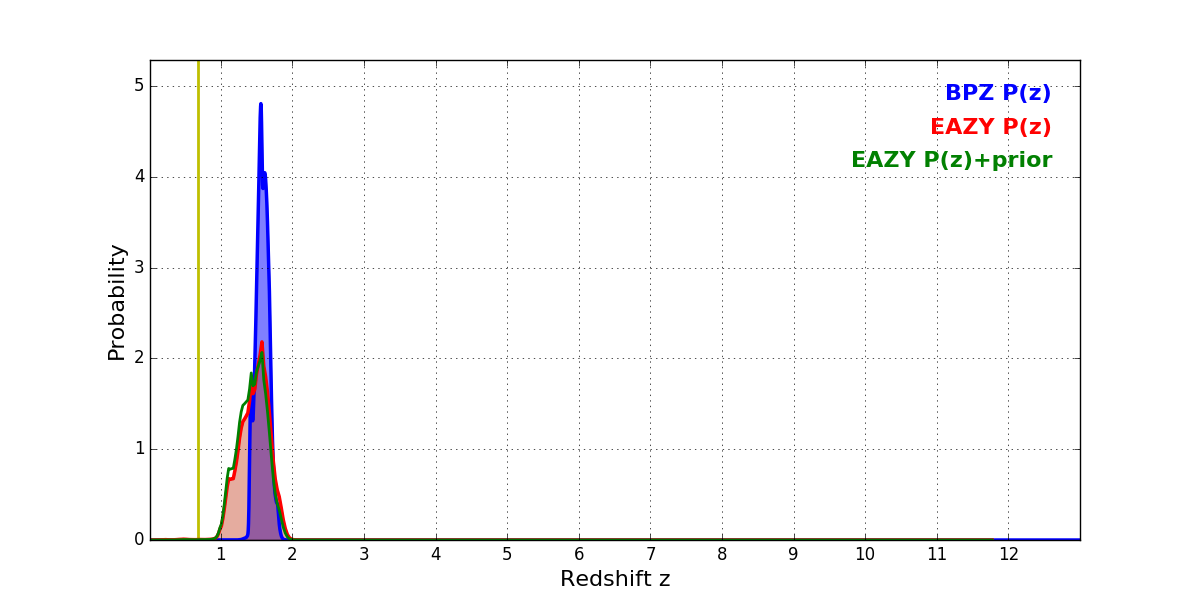In P(z) plots: Yellow lines mark the cluster redshift z = 0.677,
