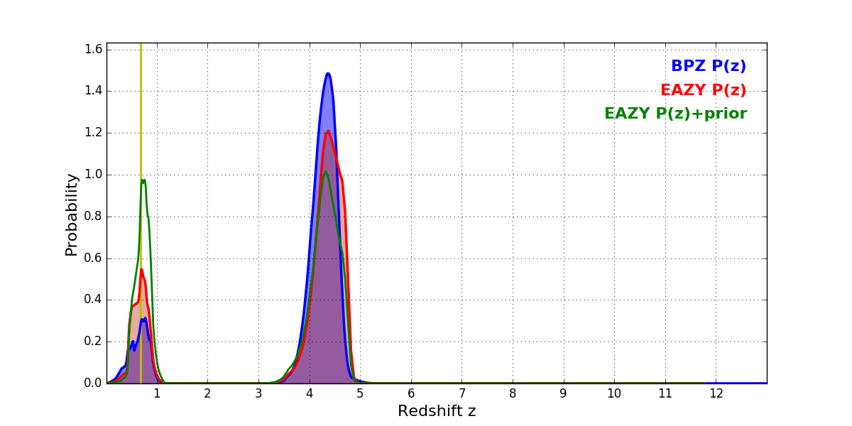 In P(z) plots: Yellow lines mark the cluster redshift z = 0.677,