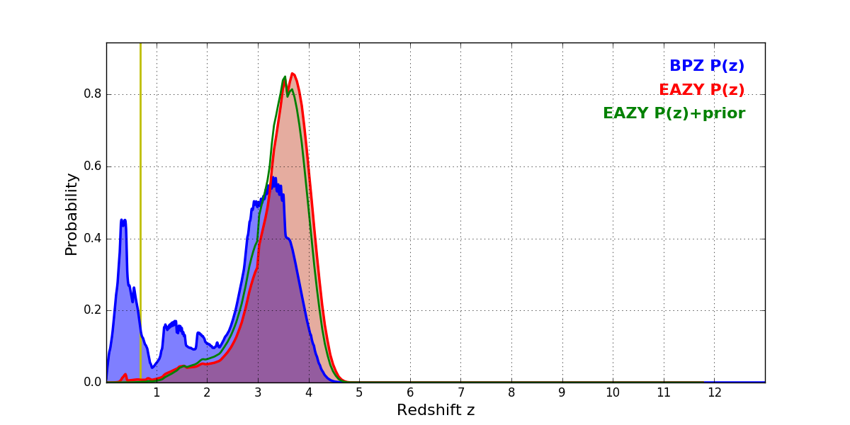 In P(z) plots: Yellow lines mark the cluster redshift z = 0.677,