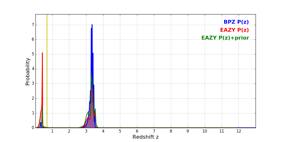 In P(z) plots: Yellow lines mark the cluster redshift z = 0.677,