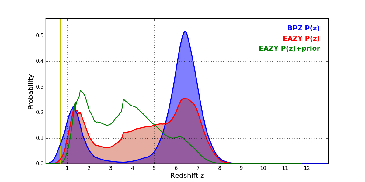 In P(z) plots: Yellow lines mark the cluster redshift z = 0.677,